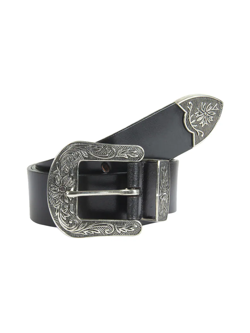 amps up the simplest outfit with adding this western design cowboy three-piece buckle black belt. crafted with finest of the plain black genuine leather strap which ensures high quality and durability. features western classic cowboy design buckle which is antique silver finish and nickel-free. made in india with a high standard of quality and craftsmanship.