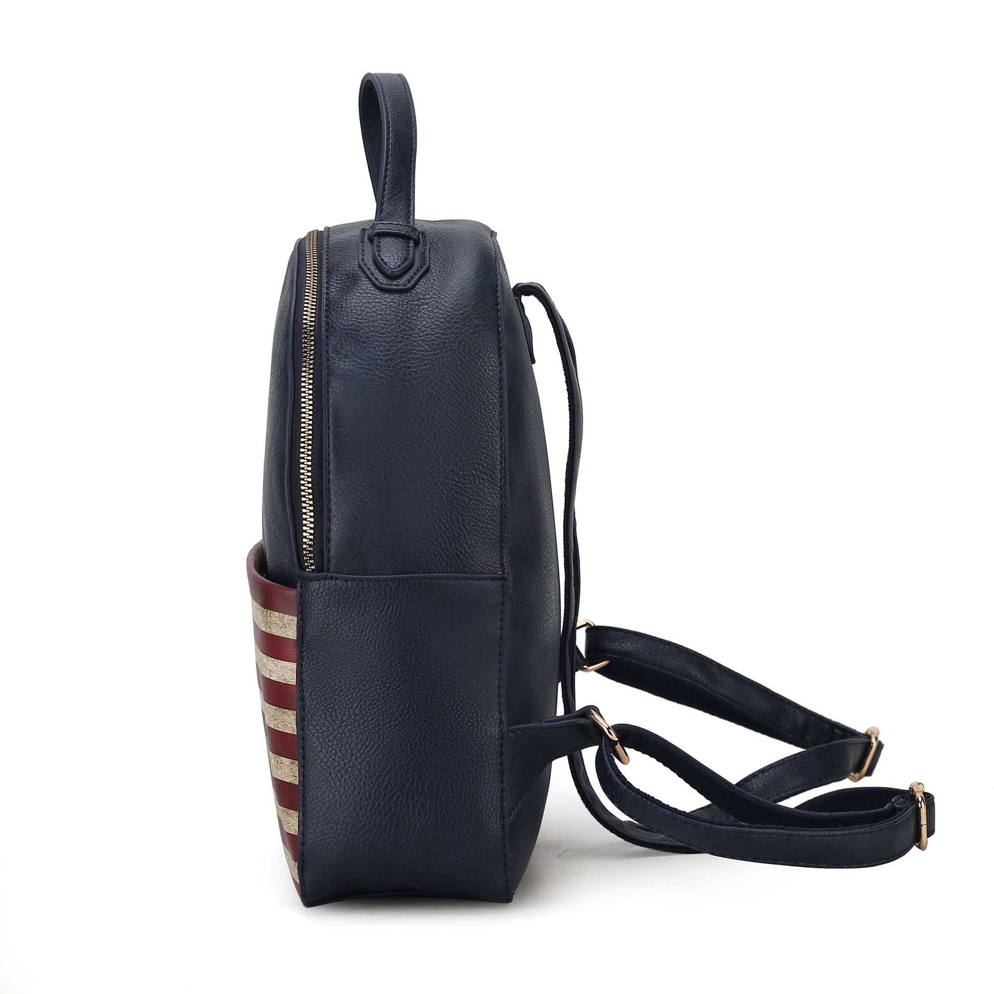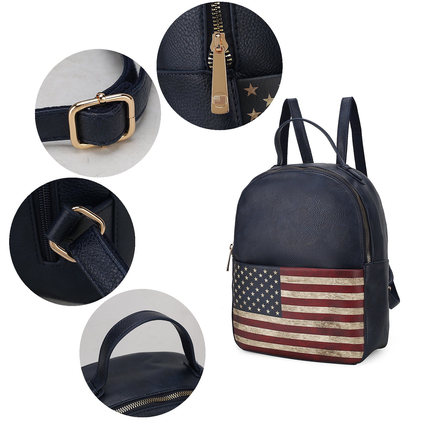 Our Briella Backpack is the bag you will carry season after season. Rendered in a printed patriotic pattern in high-quality vegan leather, this one-compartment bag is designed to stow all you need for a busy day. Unzips the bag to reveal a printed lined interior with a wall zippered pocket and a slip pocket. Designed with gold-tone embellishments, the Briella Backpack has a softly structured silhouette with a flat base for stability. Take the Briella Backpack on daily commutes, weekend trips, and everywhere in between.