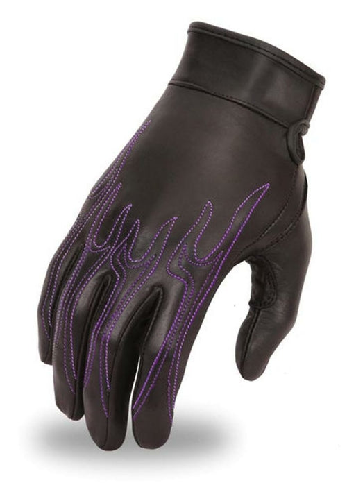 Women’s gel palm driving gloves in Aniline cowhide with contrast embroidered flame design, light liner, and Velcro strap on wrist. FI113GEL