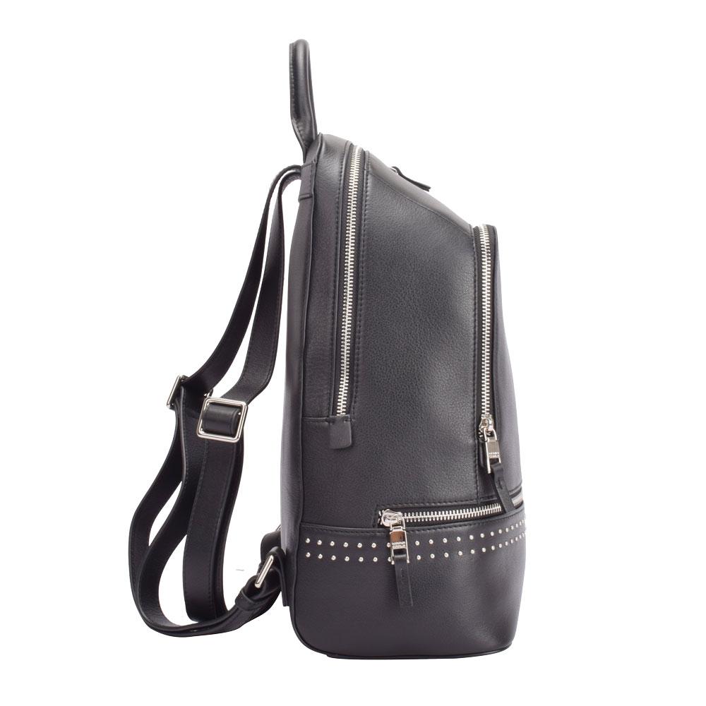 Exterior: Front Compartment with zip closure. Bottom front zip slip pocket. Silver metal detailing.