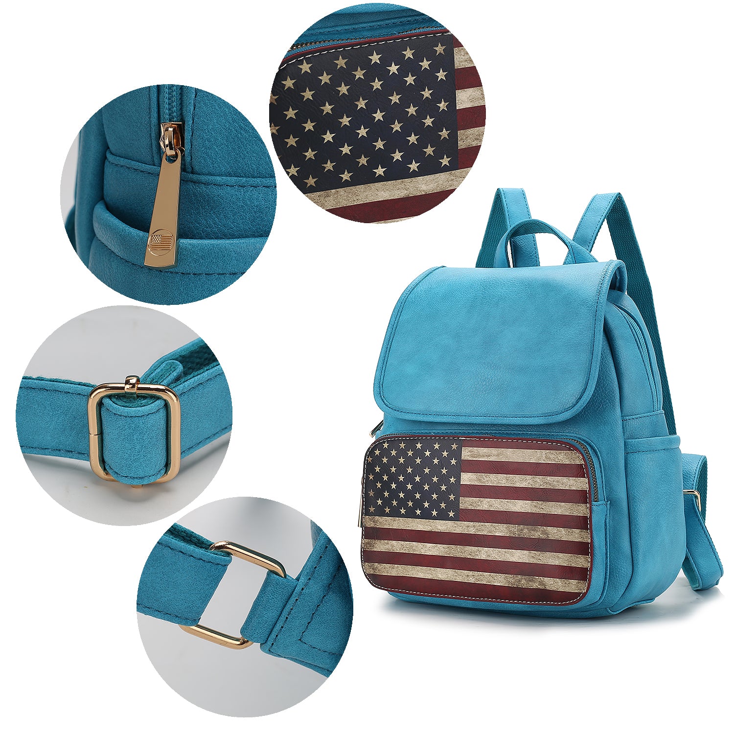 Our Regina Backpack will take you from your daily commute to weekend adventures in style. Rendered in a printed patriotic flag pattern in high-quality vegan leather, this bag is