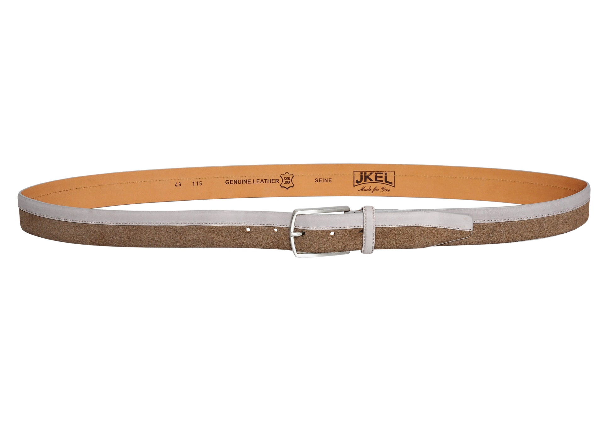 The Siene Beige Leather Men Suede Belt is a modern accessory perfect for adding a sleek touch to your look. Made from soft Beige suede, it's both stylish and comfortable to wear. The belt features a light grey leather trim that enhances its design and adds to its durability. With a simple silver buckle, it's easy to adjust and secure, making it a practical choice for daily wear. This belt is ideal for anyone looking to combine functionality with a fashionable edge, fitting seamlessly into both casual and more formal outfits.