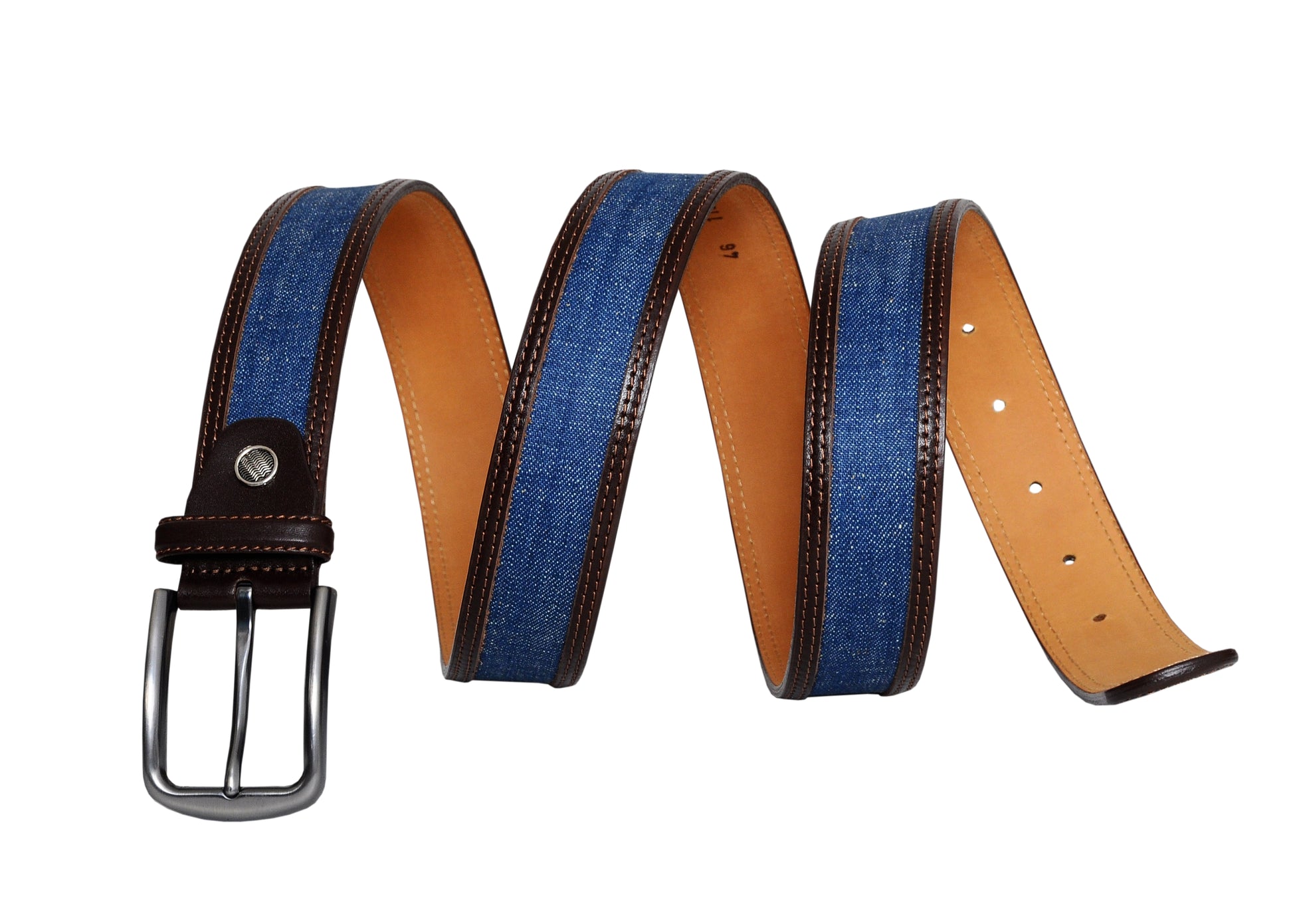 The Swindon Brown Blue Leather Men Belt is a stylish accessory that combines the rugged look of brown leather with a unique blue denim fabric. This belt features a sleek design, with the blue denim inlay adding a casual yet distinctive touch to the overall appearance. The silver buckle provides a classic finish, making it easy to adjust and secure the belt for a comfortable fit.