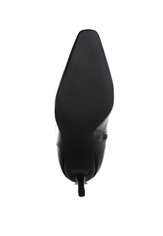 leThe patent faux leather calf boots have a decadent candy-like aesthetic with the shiny patent detail, the snip toe adds a quirky visual detail while the stiletto heels look sexy. The calf boots have a quirky yet chic allure which is sure to elevate any outfit you pair it with. The boots have an easy to wear zipper fastening and soft cushion insoles that offer a comfortable walkability feature.